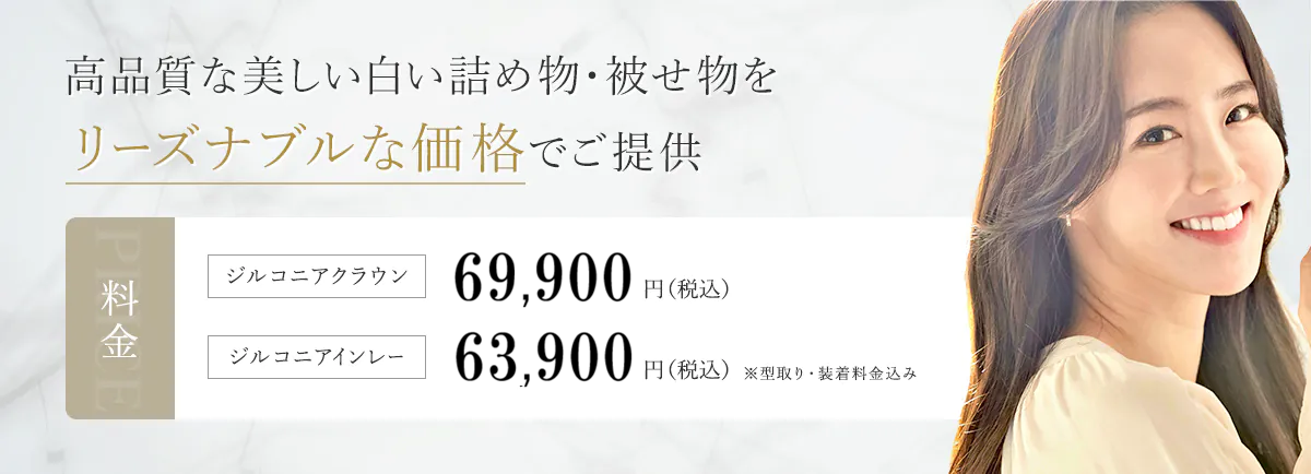 当院では、自然な白さと美しさを兼ね備えたジルコニアを低価格で提供しています。ジルコニアは、従来のセラミックに比べて10倍以上の強度を持っています。さらに、審美性に優れ、かみ合わせにも強く、前歯から奥歯、さらにはブリッジまで幅広い治療に対応しています。
