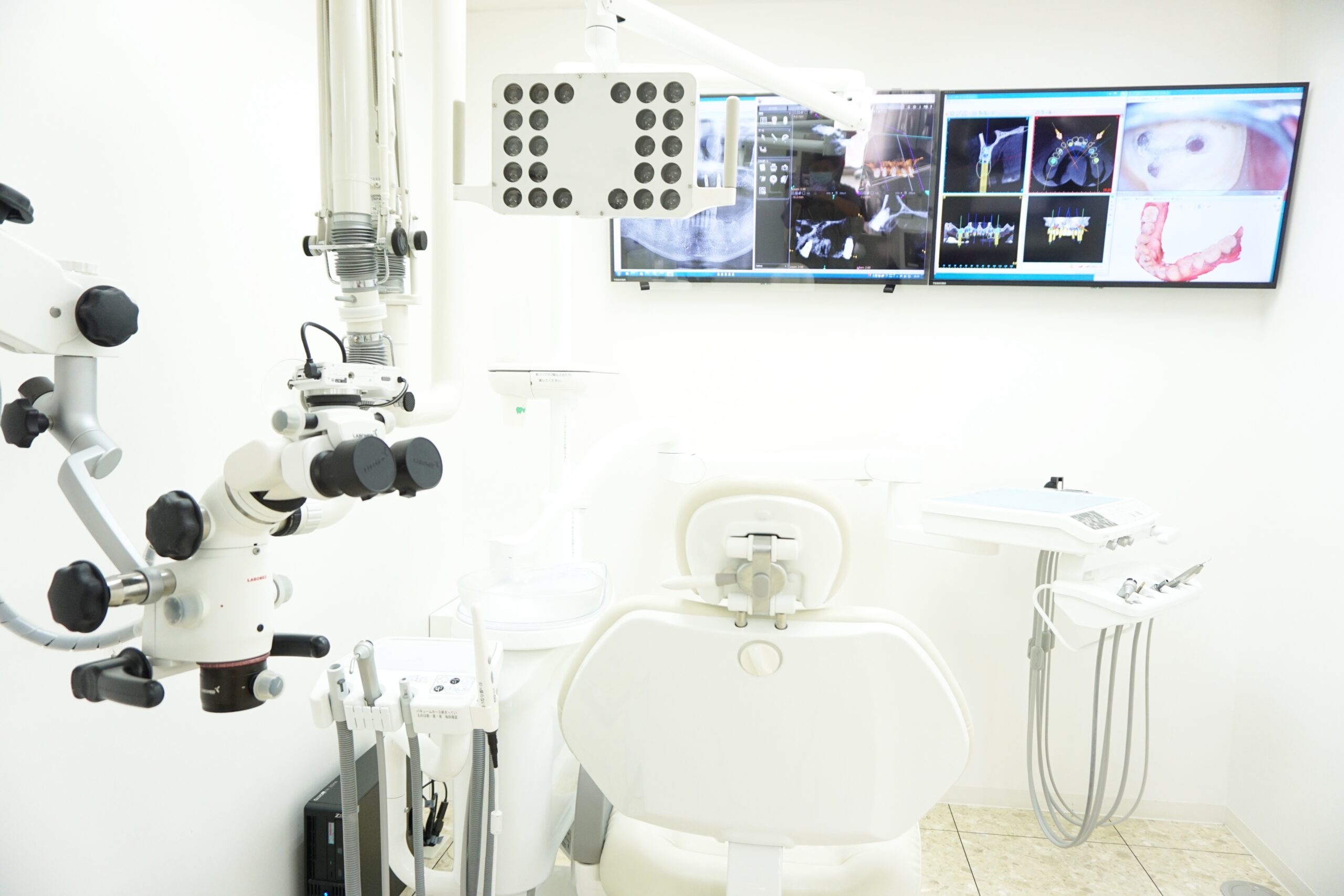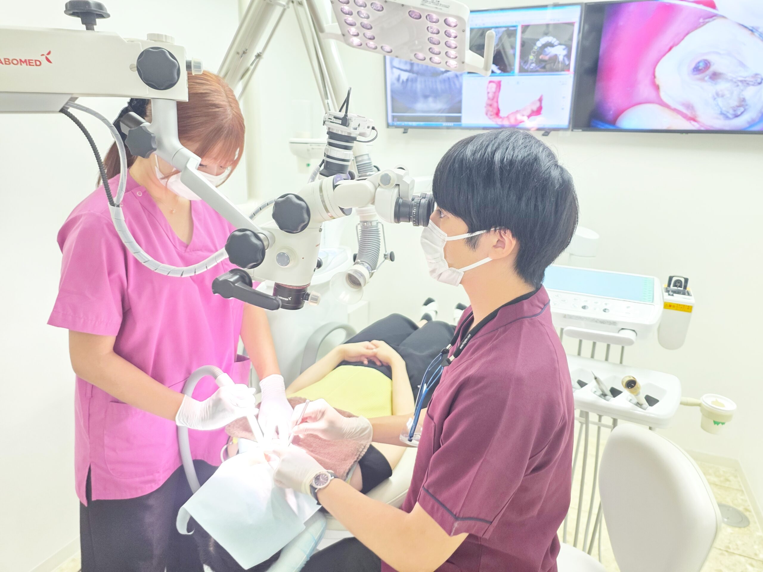各診療台は、天井まで完全に仕切られた個室空間になっています。長時間でも疲れないフカフカの診療台です。通常の2倍の光量があるオペライトを完備しています。マイクロスコープ使用によるより精度を上げた治療を行っています。